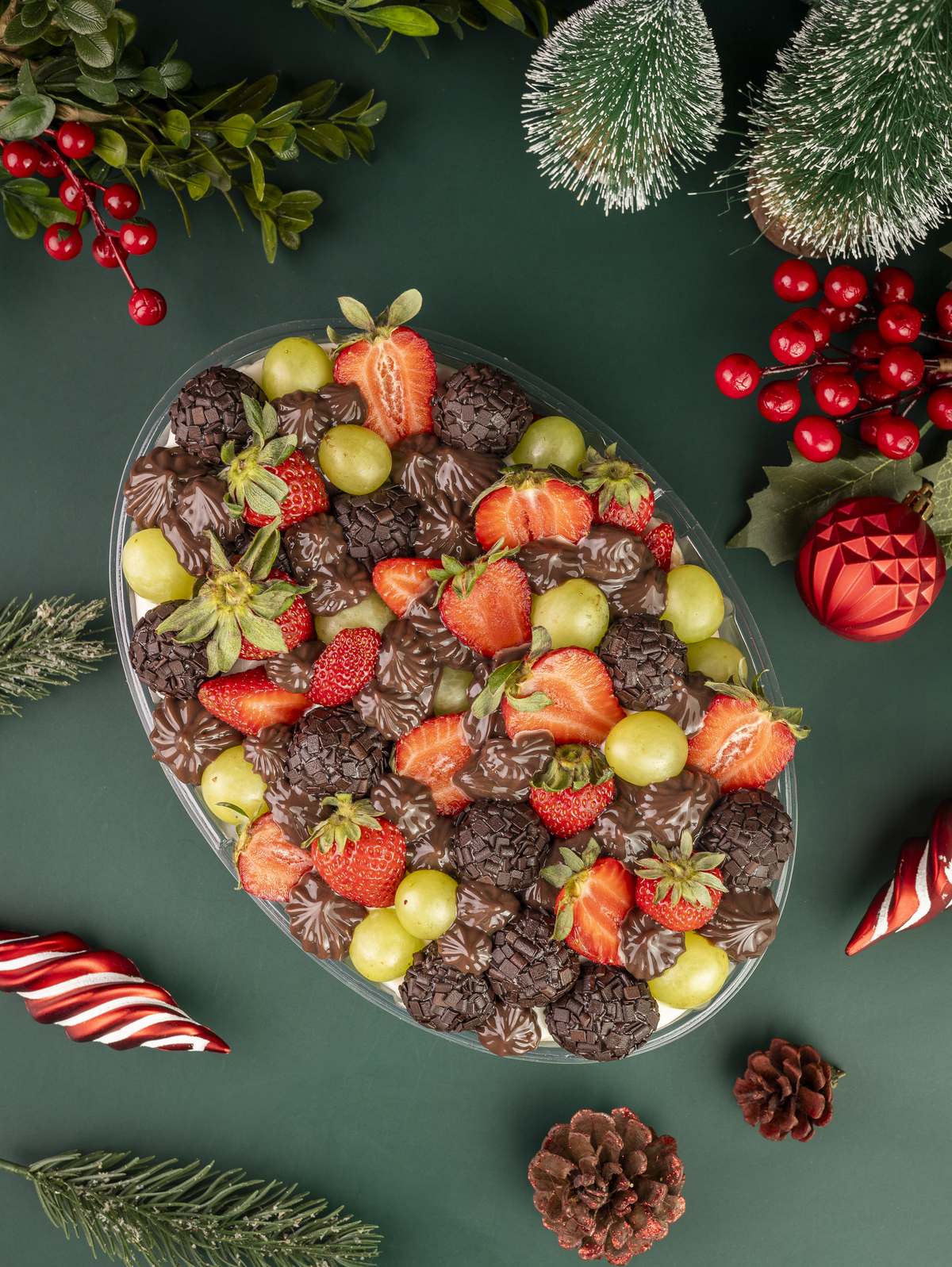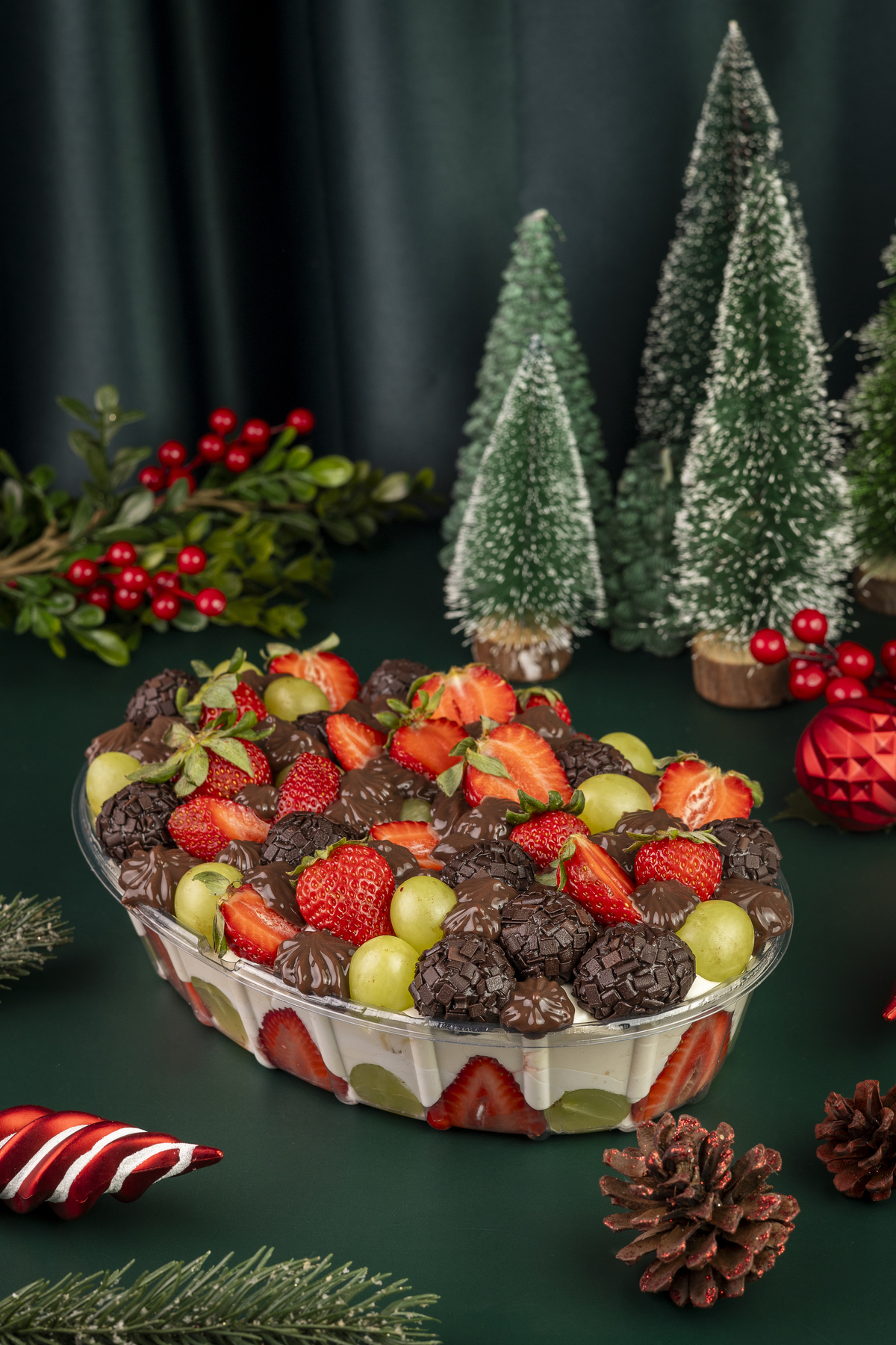 Uma sessão de fotos de natal bem tradicional para uma confeitaria, nas cores verde com vermelho