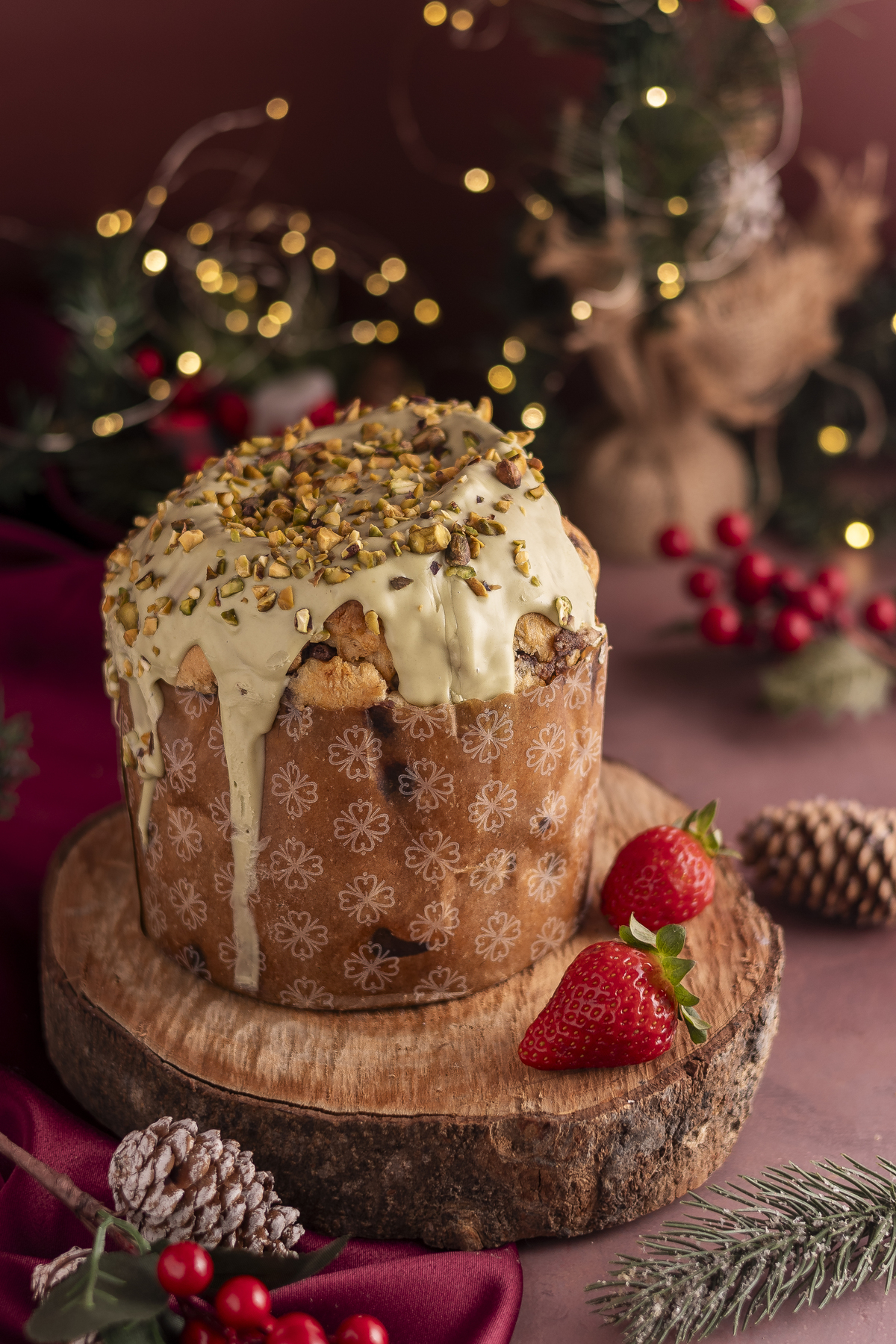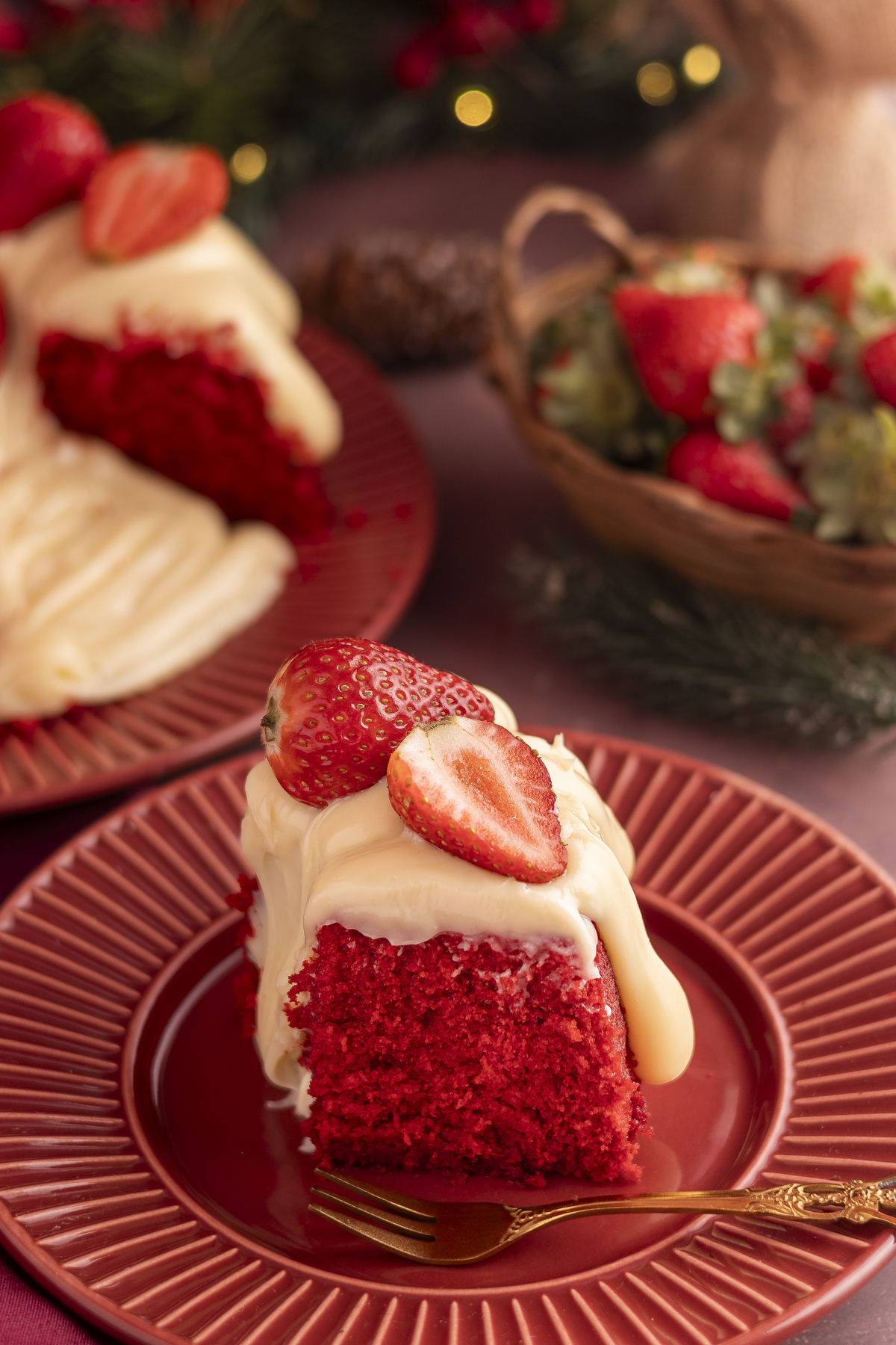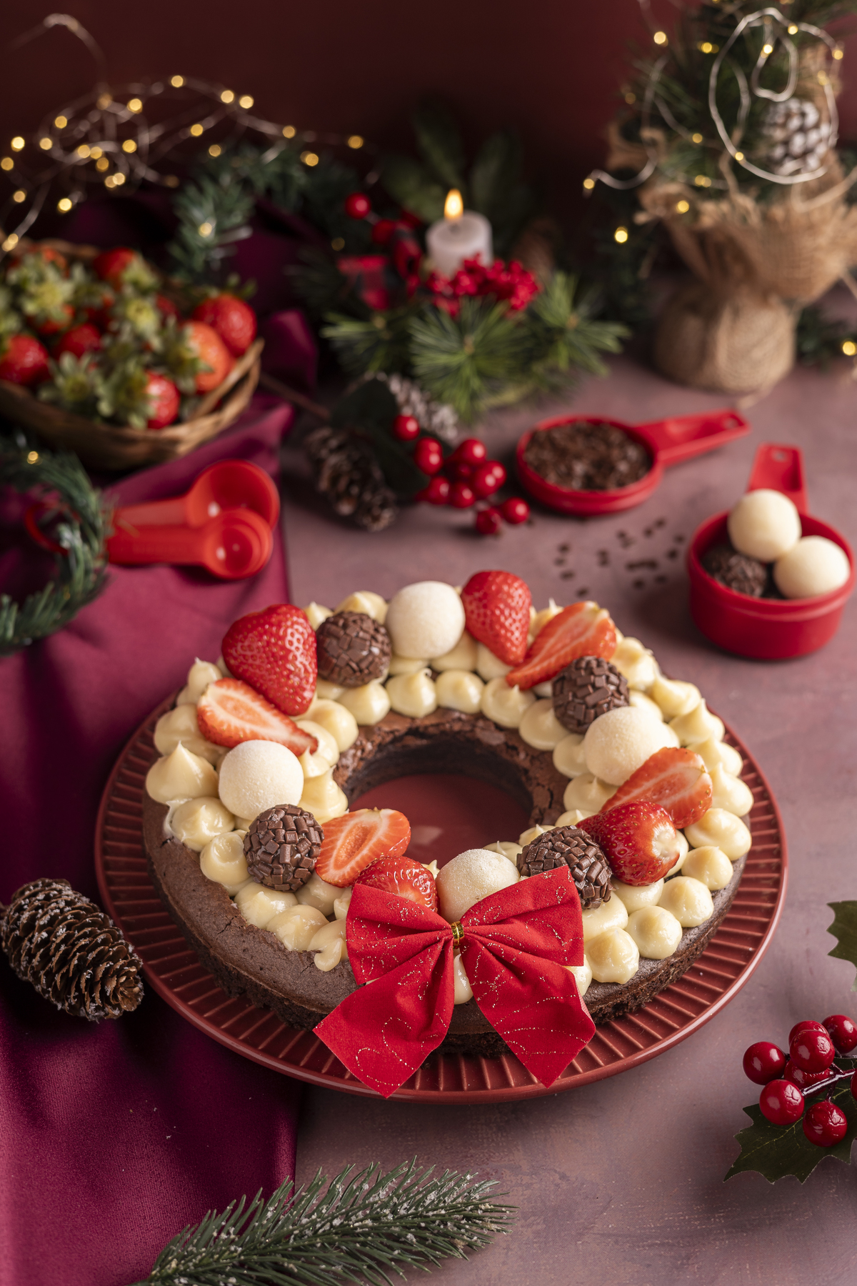 Uma sessão de fotos de natal tradicional, predominando tons de vermelho com madeira