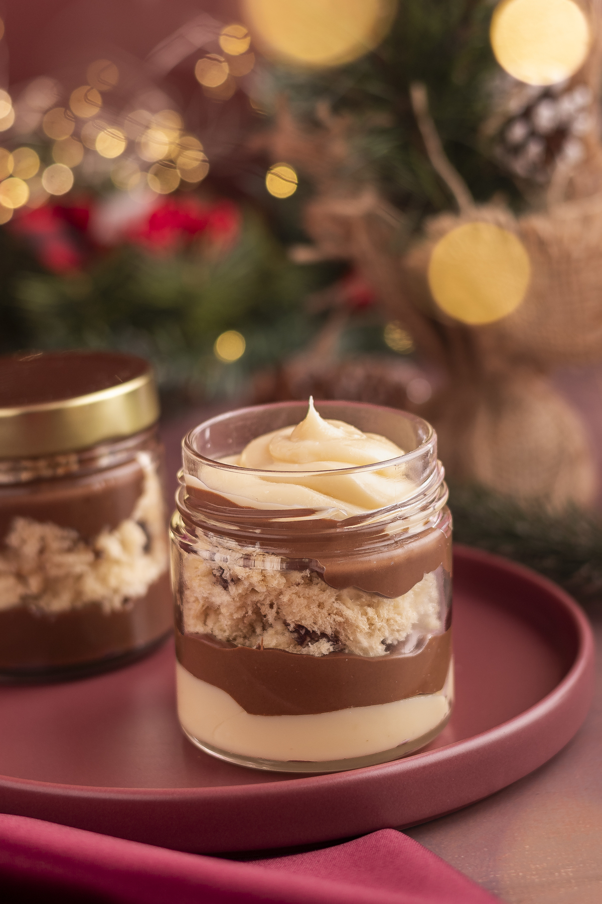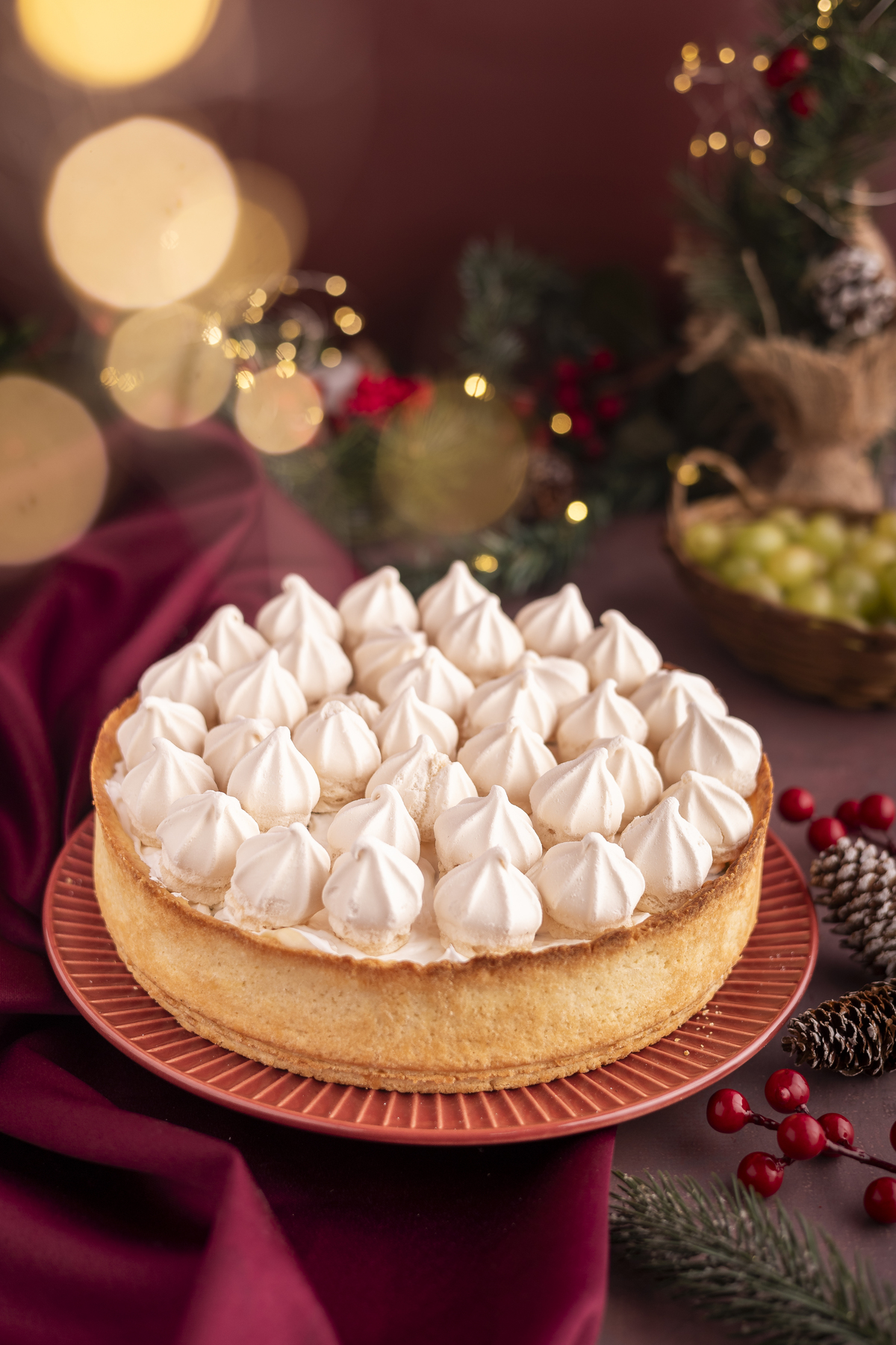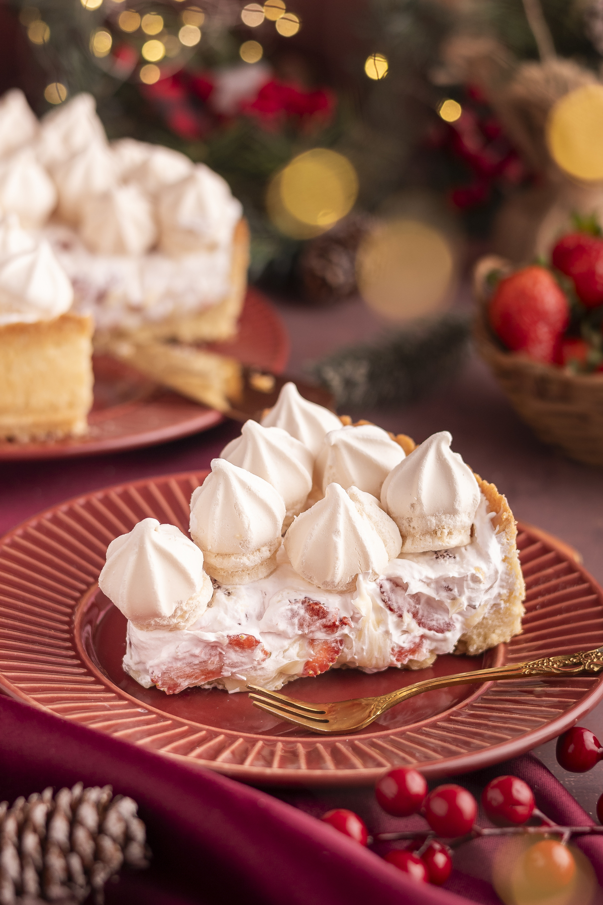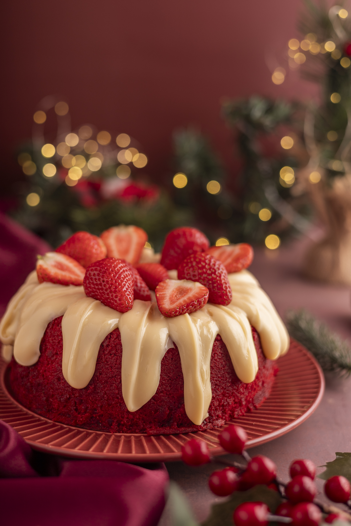 Uma sessão de fotos de natal tradicional, predominando tons de vermelho com madeira