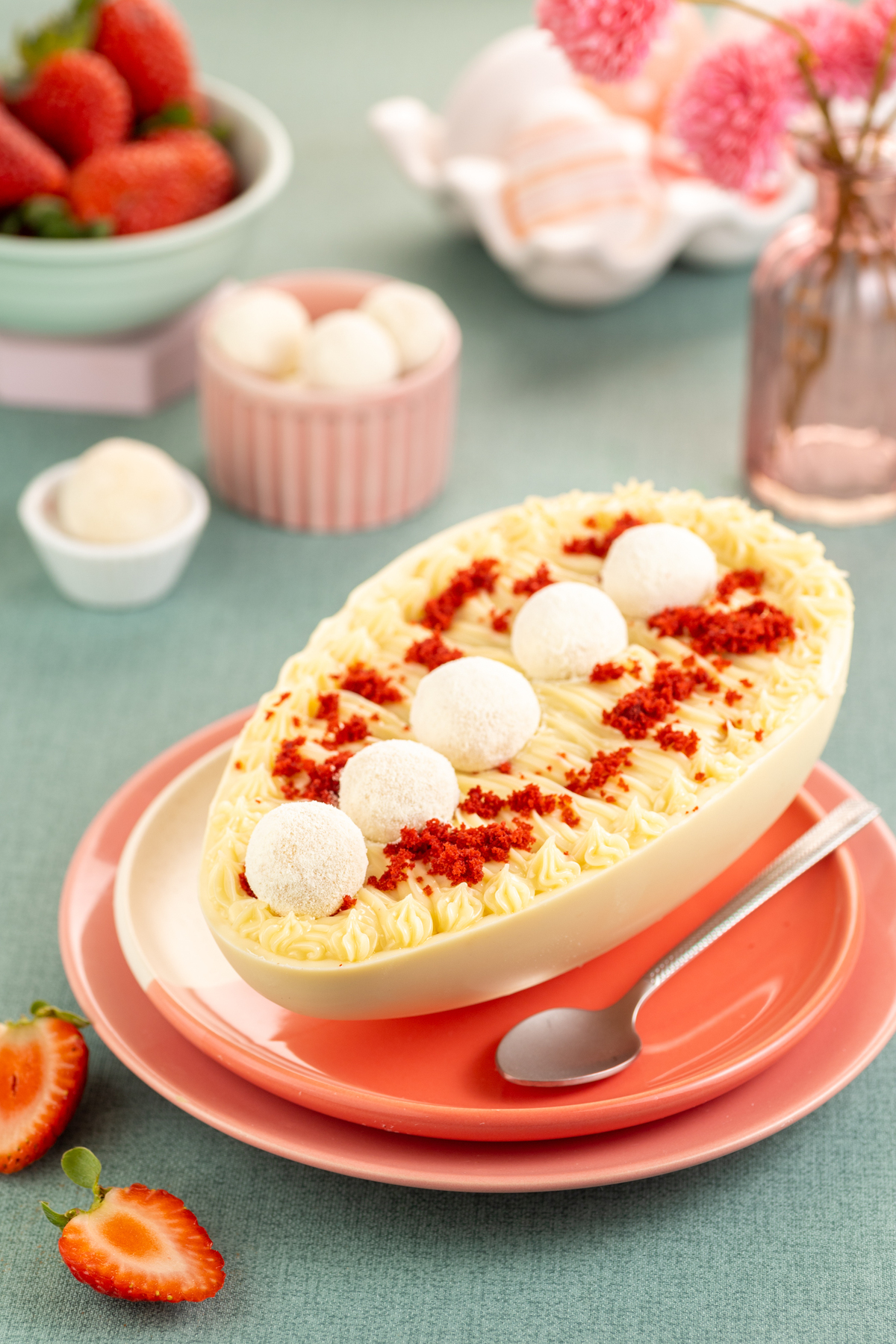 Uma sessão de fotos de ovos de páscoa verde água e elegante.