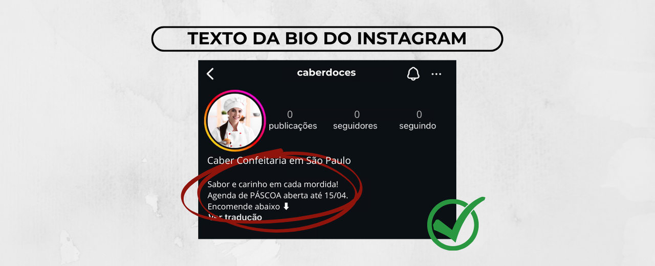 Bio: é aqui que você escreve mais da sua marca, do seu propósito e impacta um pouco mais o cliente. É preciso saber ser simples, objetivo e se expressar no menor número de palavras possível. Na internet, as pessoas gostam de rapidez e praticidade. Se a sua bio estiver muito longa e técnica, as pessoas não vão ler.