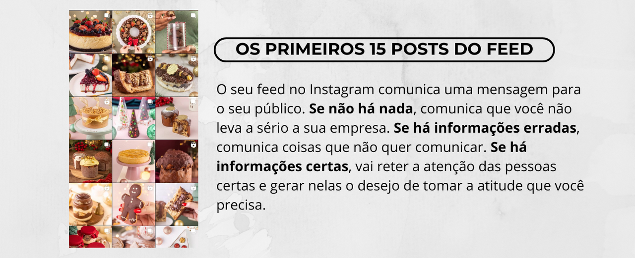 Primeiros 15 posts do seu feed: Agora você vai precisar trabalhar o seu marketing e criar 15 posts, pelo menos, para que o seu perfil fique completo e gere mais confiança. Esses 15 posts são os que aparecem quando o cliente elimina todas as outras partes do seu perfil da tela do celular e visualiza somente os posts, sabe? Chamamos isso de feed.